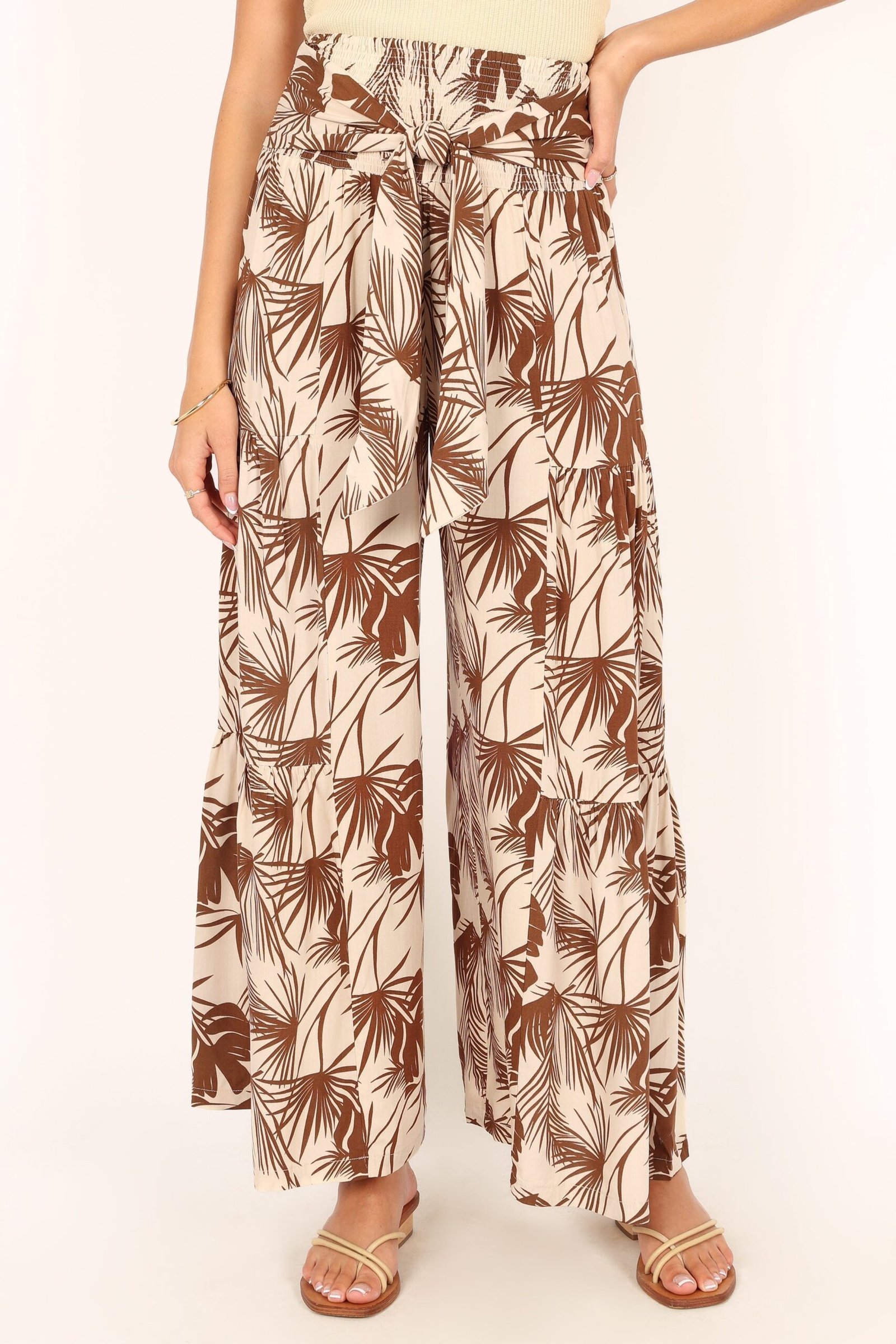 DETAILS Our High Waisted Wide Leg Pants are an absolute must-have for your wardrobe. Crafted with a shirred waist band and attached waist tie, these pants create a flattering silhouette while giving you comfortable movement. The bold tropical leaf print will bring the perfect pop of color to your closet.