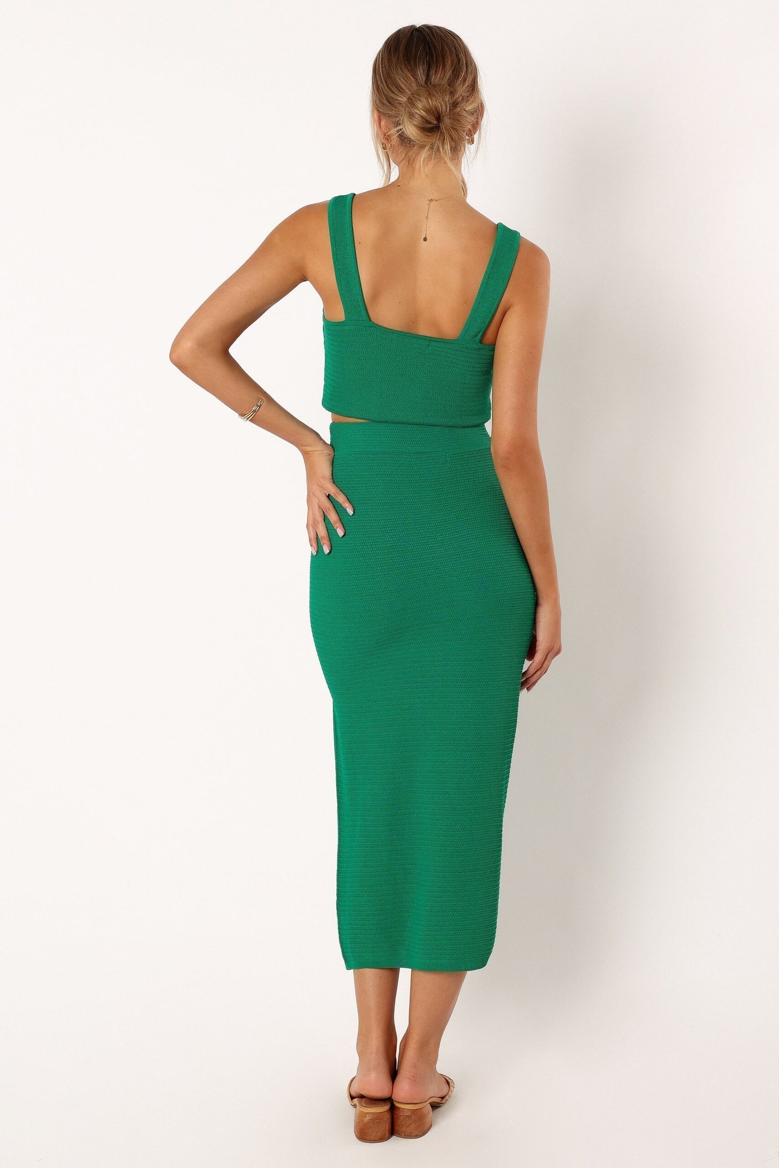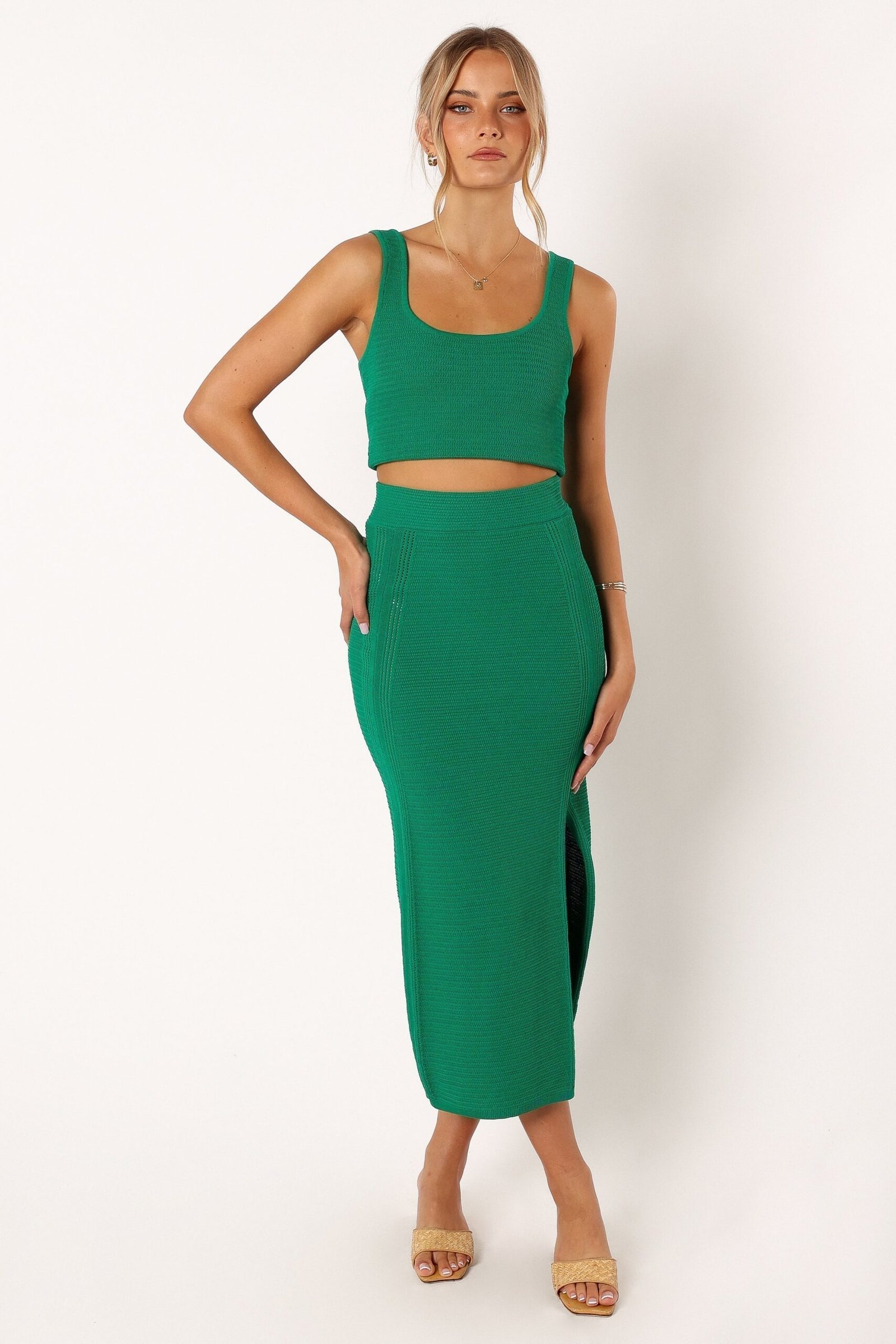 DETAILS Make sure you add a midi length skirt to your wardrobe this season. An absolute must-have, this knitted skirt has an elasticised waist for optimal comfort and it features a side split detail that adds just the right amount of chicness.